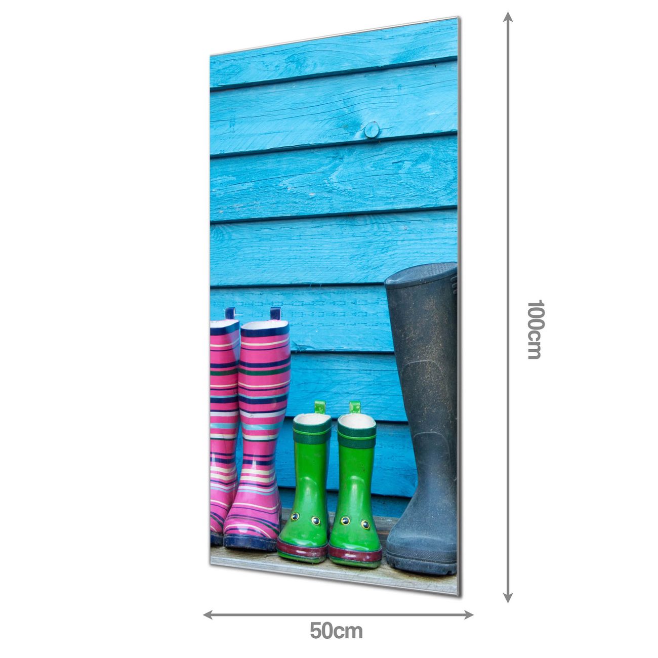 Material: 4mm Sicherheitsglas mit Metallrückwand Eigenschaften: beschreibbar, magnetisch, kratzfest Maße: 50x100x0,6cm, 7,50 kg schwer Motiv Nummer 10359 Gummistiefel Zubehör: inklusive 4 Neodym-Magnete
