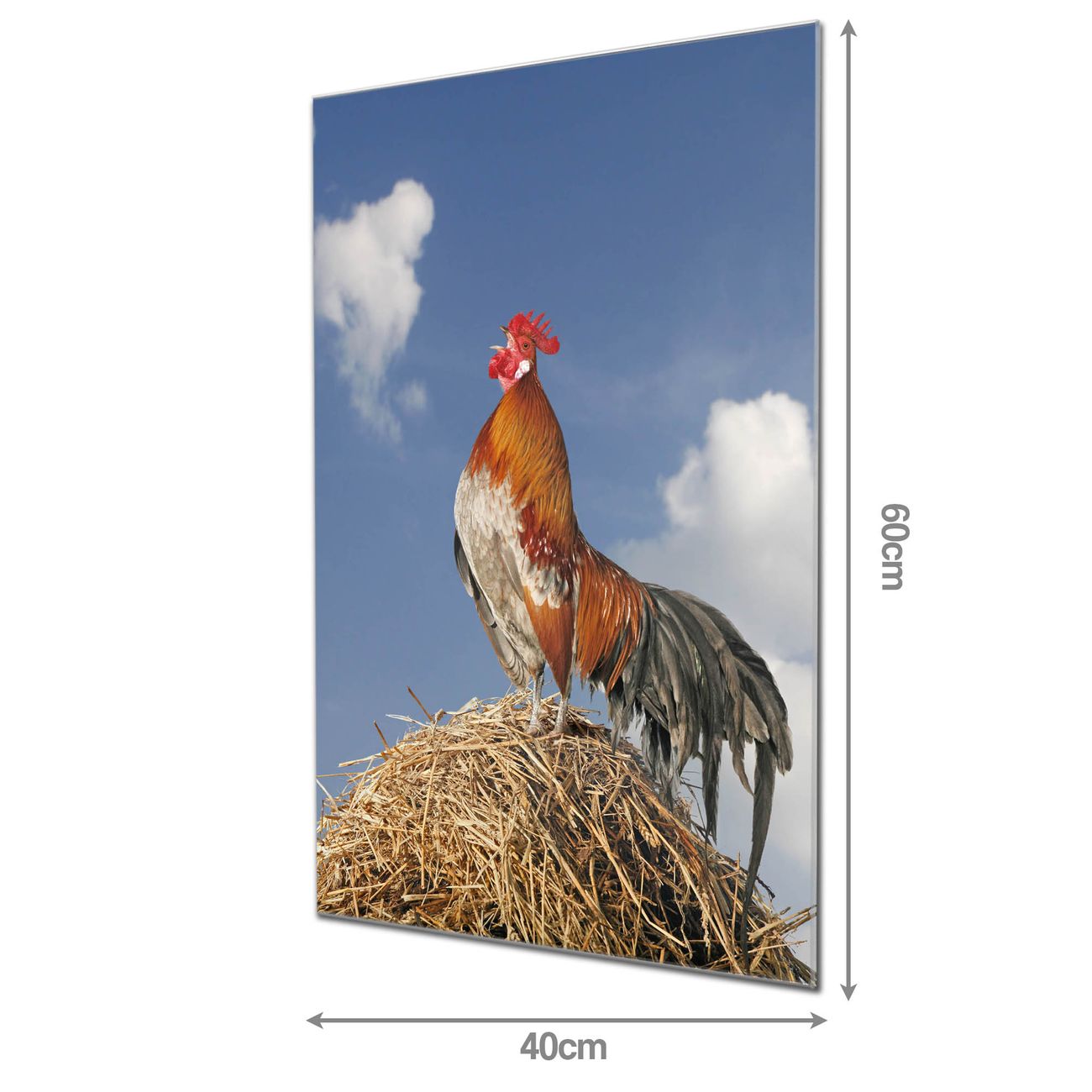 Material: 4mm Sicherheitsglas mit Metallrückwand Eigenschaften: beschreibbar, magnetisch, kratzfest Maße: 40x60x0,6cm, 3,60 kg schwer Motiv Nummer 10519 Hahn Zubehör: inklusive 4 Neodym-Magnete