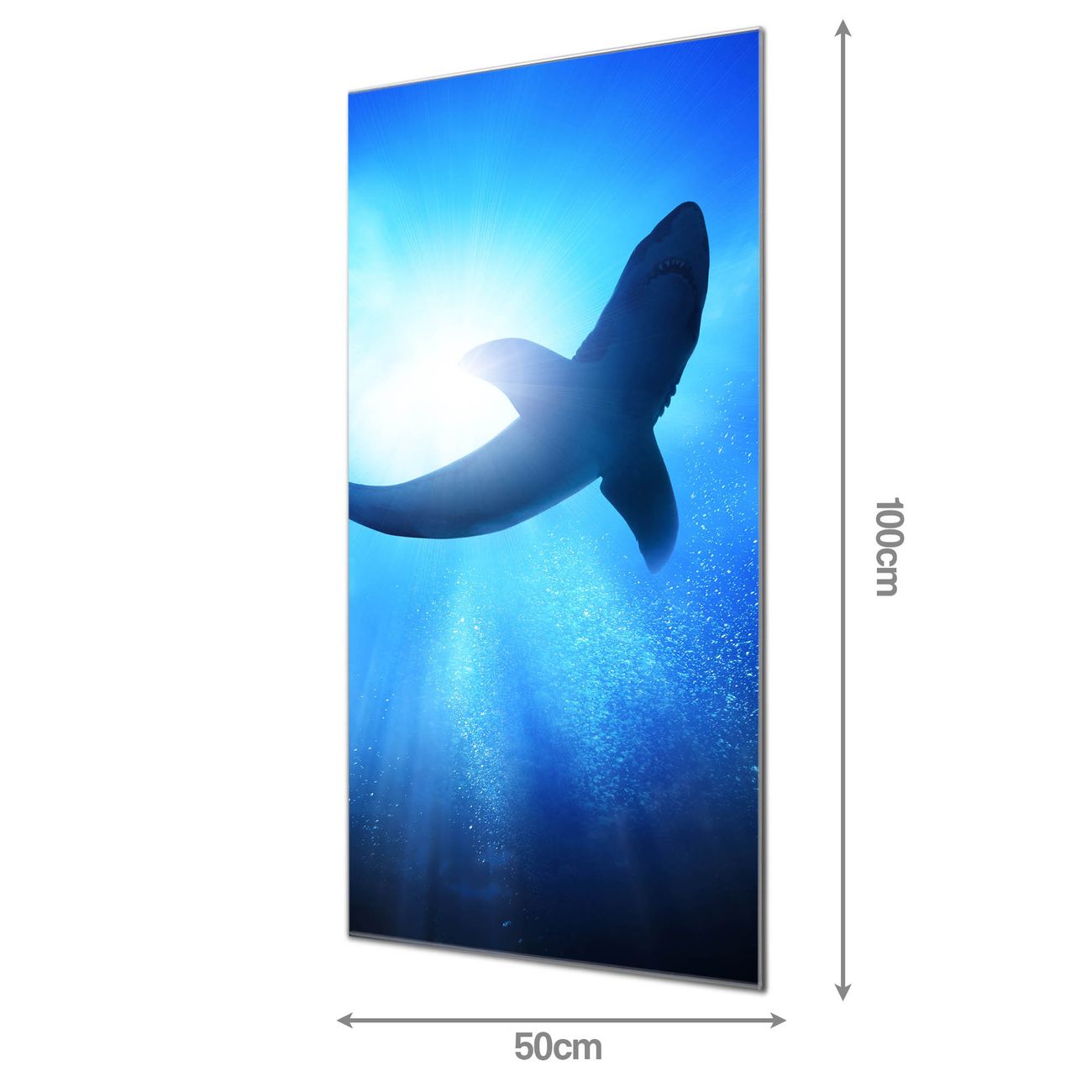 Material: 4mm Sicherheitsglas mit Metallrückwand Eigenschaften: beschreibbar, magnetisch, kratzfest Maße: 50x100x0,6cm, 7,50 kg schwer Motiv Nummer 10425 Hai Zubehör: inklusive 4 Neodym-Magnete