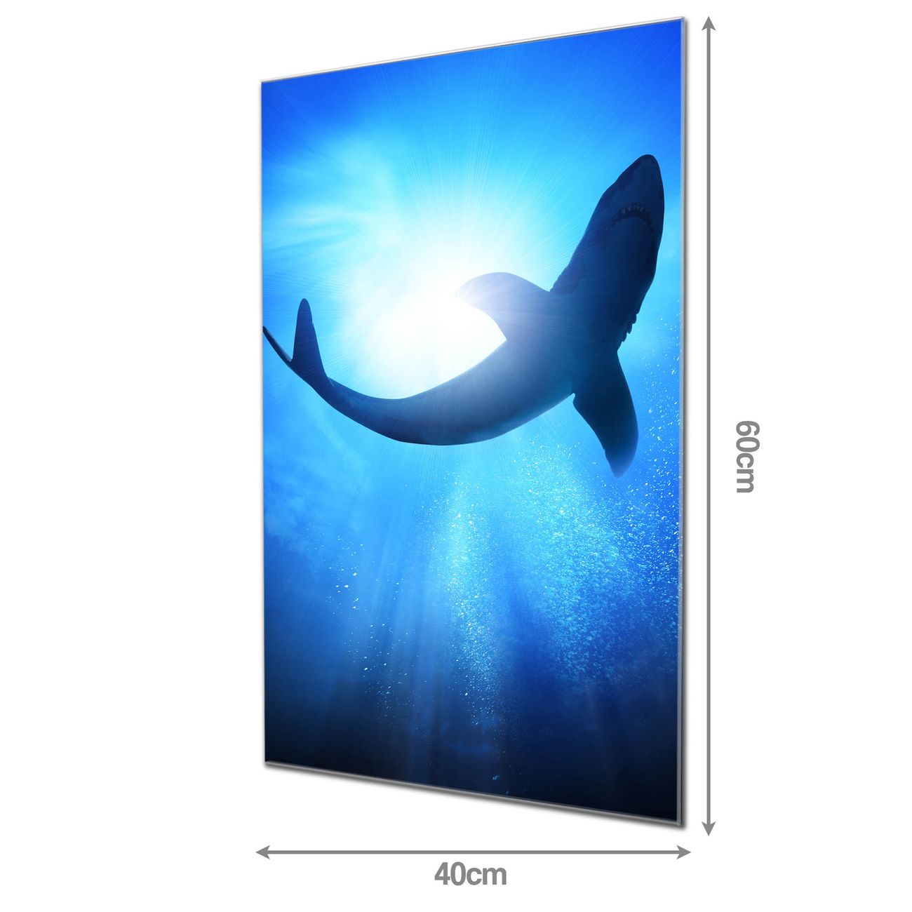 Material: 4mm Sicherheitsglas mit Metallrückwand Eigenschaften: beschreibbar, magnetisch, kratzfest Maße: 40x60x0,6cm, 3,60 kg schwer Motiv Nummer 10425 Hai Zubehör: inklusive 4 Neodym-Magnete