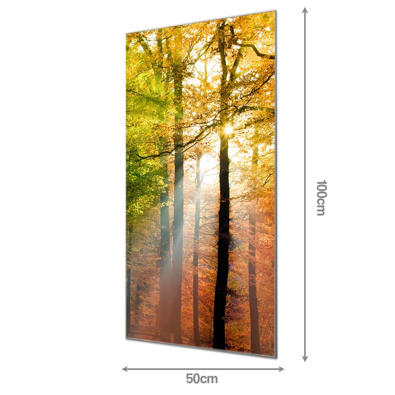 Material: 4mm Sicherheitsglas mit Metallrückwand Eigenschaften: beschreibbar, magnetisch, kratzfest Maße: 50x100x0,6cm, 7,50 kg schwer Motiv Nummer 10041 Herbstwald Zubehör: inklusive 4 Neodym-Magnete