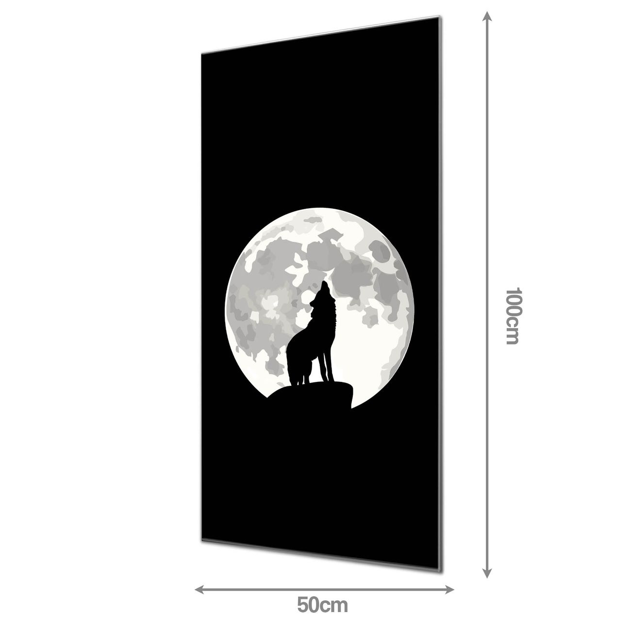 Material: 4mm Sicherheitsglas mit Metallrückwand Eigenschaften: beschreibbar, magnetisch, kratzfest Maße: 50x100x0,6cm, 7,50 kg schwer Motiv Nummer 11023 Heulender Wolf SW Zubehör: inklusive 4 Neodym-Magnete