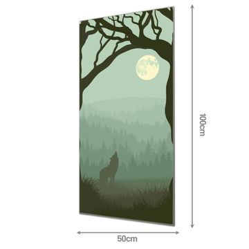 Material: 4mm Sicherheitsglas mit Metallrückwand Eigenschaften: beschreibbar, magnetisch, kratzfest Maße: 50x100x0,6cm, 7,50 kg schwer Motiv Nummer 11022 Heulender Wolf Zubehör: inklusive 4 Neodym-Magnete