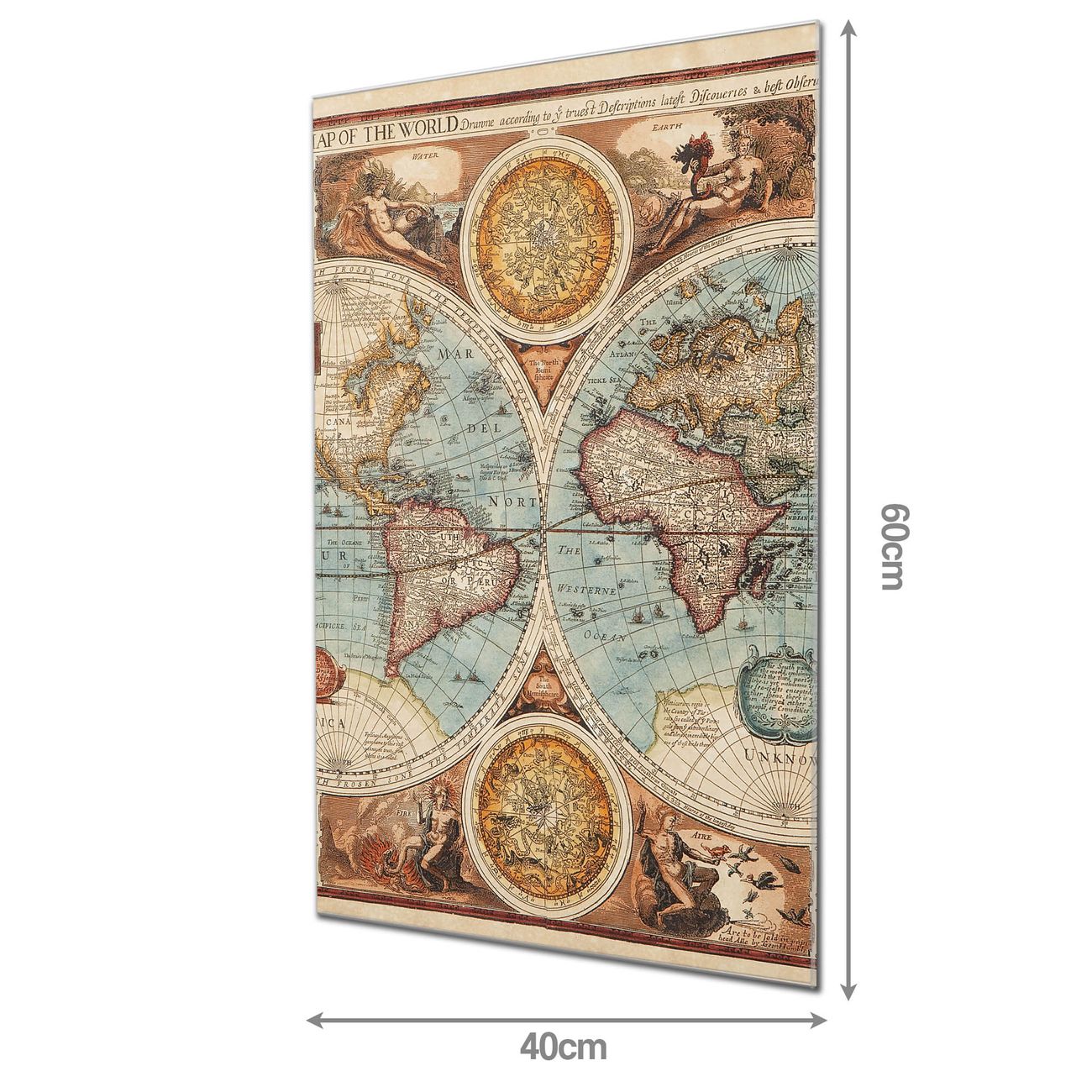 Material: 4mm Sicherheitsglas mit Metallrückwand Eigenschaften: beschreibbar, magnetisch, kratzfest Maße: 40x60x0,6cm, 3,60 kg schwer Motiv Nummer 10550 Historische Weltkarte Zubehör: inklusive 4 Neodym-Magnete
