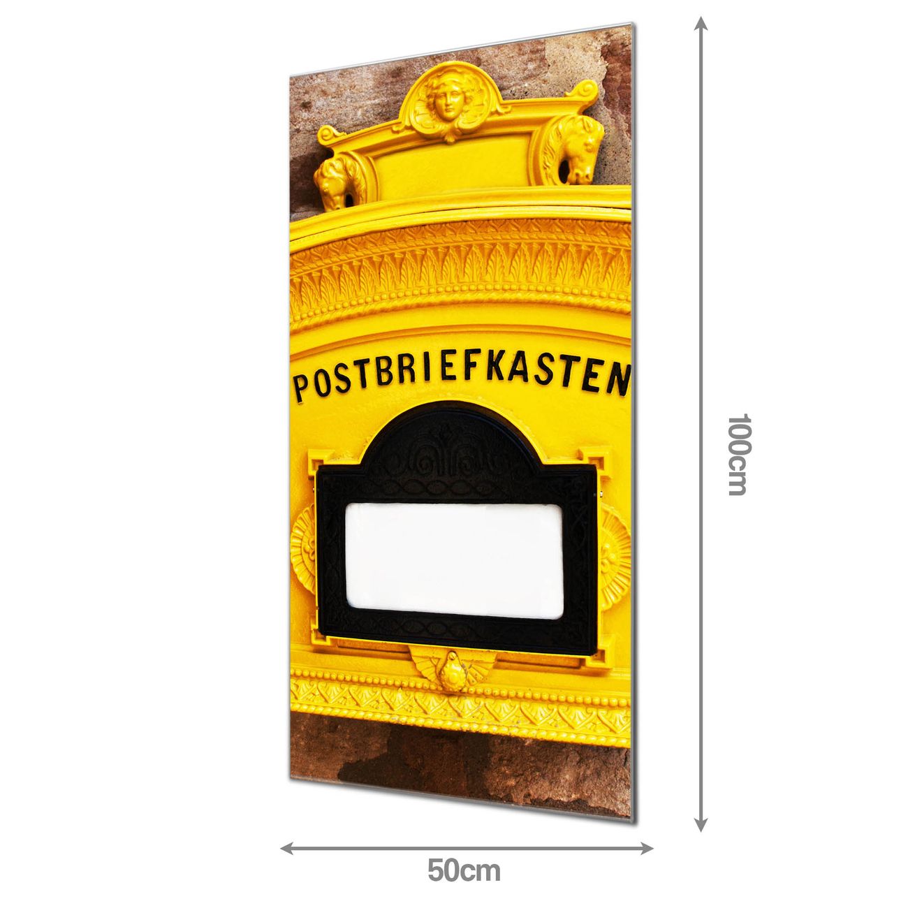 Material: 4mm Sicherheitsglas mit Metallrückwand Eigenschaften: beschreibbar, magnetisch, kratzfest Maße: 50x100x0,6cm, 7,50 kg schwer Motiv Nummer 10337 Historischer Postkasten Zubehör: inklusive 4 Neodym-Magnete