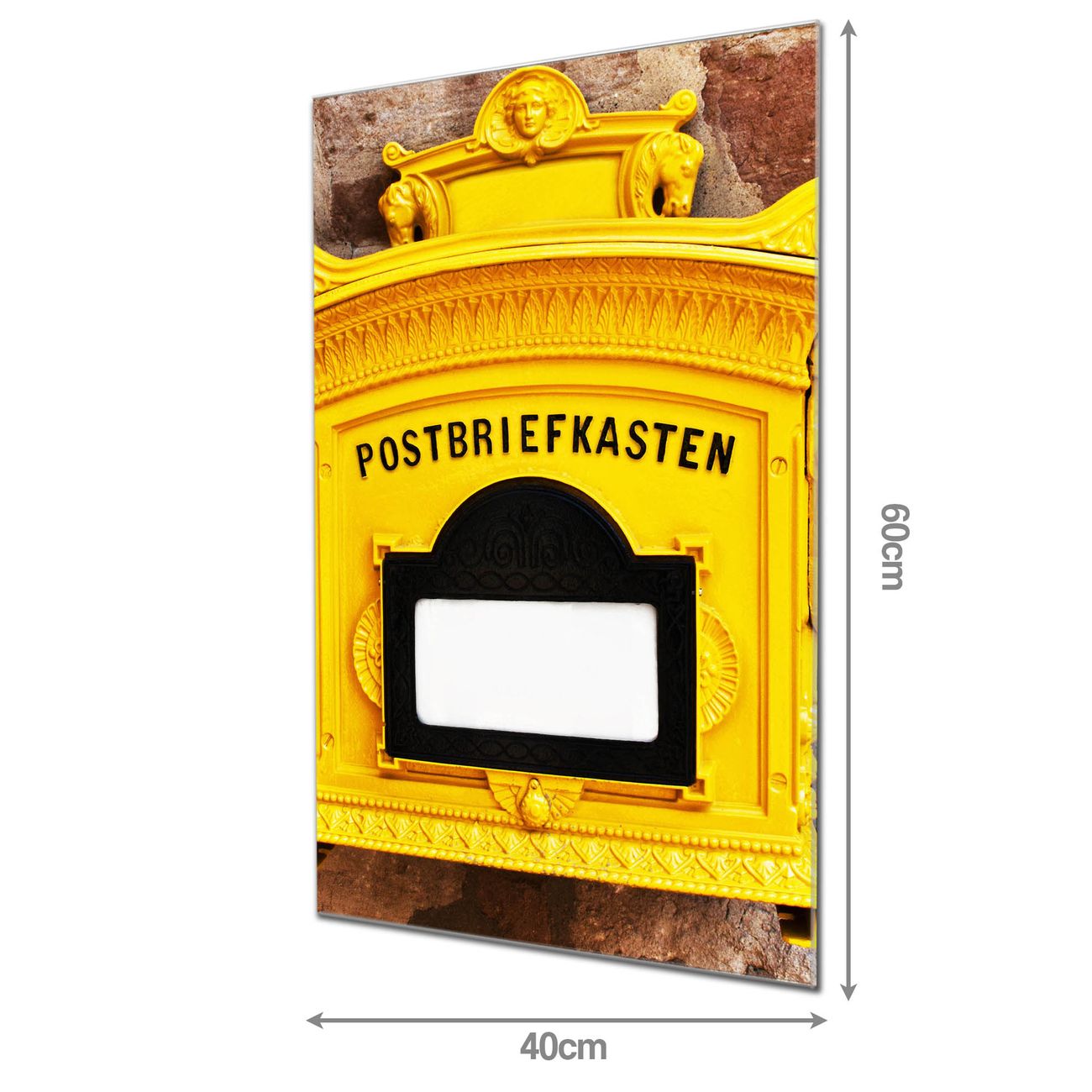 Material: 4mm Sicherheitsglas mit Metallrückwand Eigenschaften: beschreibbar, magnetisch, kratzfest Maße: 40x60x0,6cm, 3,60 kg schwer Motiv Nummer 10337 Historischer Postkasten Zubehör: inklusive 4 Neodym-Magnete
