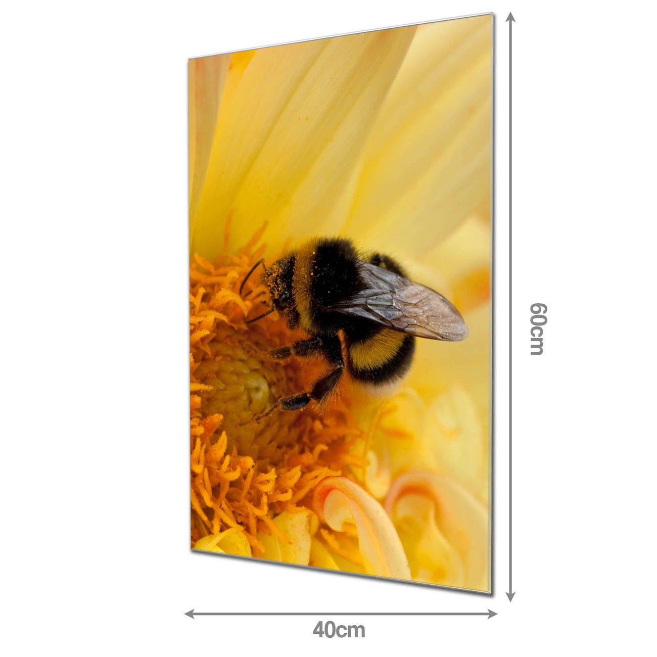 Material: 4mm Sicherheitsglas mit Metallrückwand Eigenschaften: beschreibbar, magnetisch, kratzfest Maße: 40x60x0,6cm, 3,60 kg schwer Motiv Nummer 10465 Hummel Zubehör: inklusive 4 Neodym-Magnete