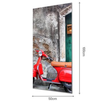 Material: 4mm Sicherheitsglas mit Metallrückwand Eigenschaften: beschreibbar, magnetisch, kratzfest Maße: 50x100x0,6cm, 7,50 kg schwer Motiv Nummer 10071 Italienischer Roller Zubehör: inklusive 4 Neodym-Magnete