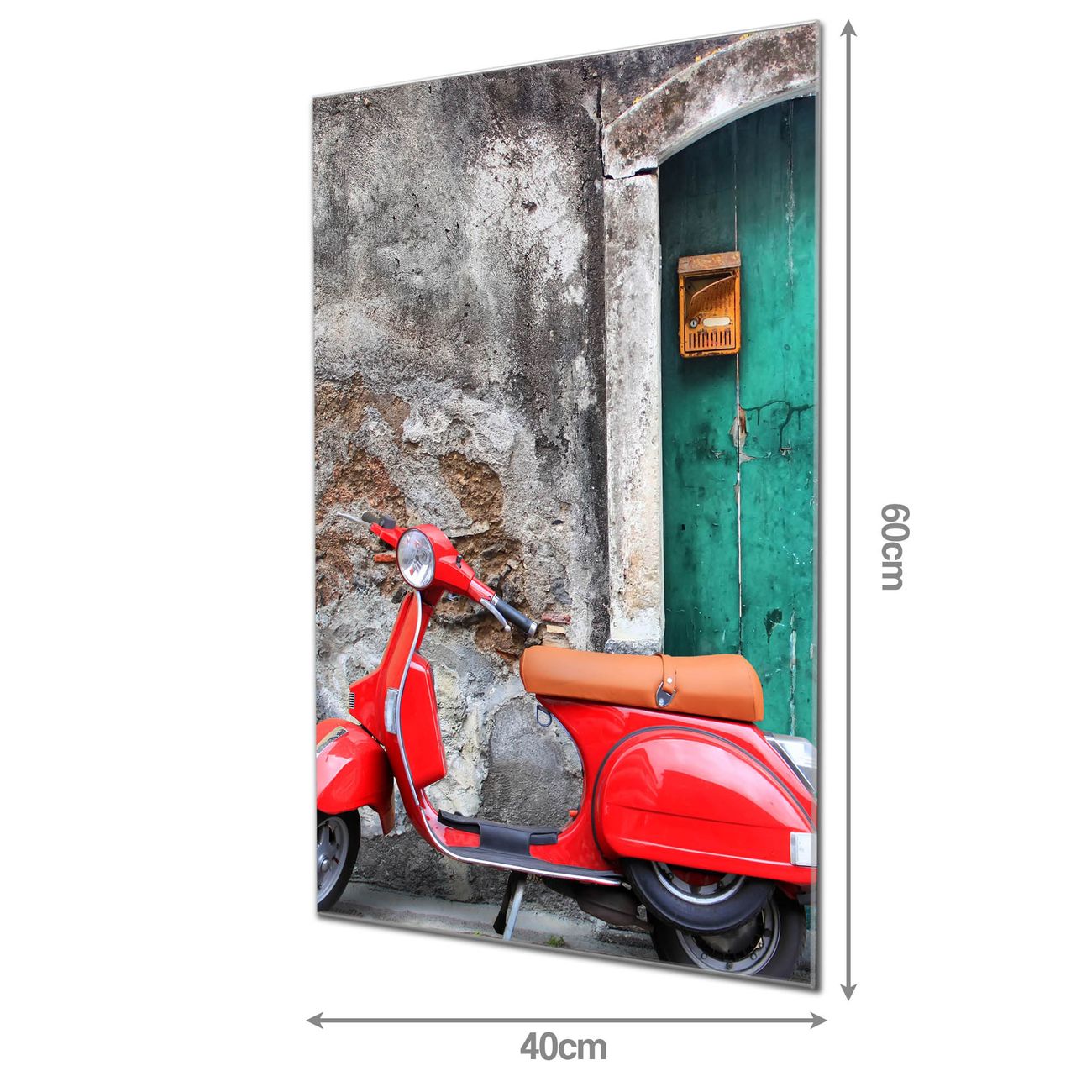 Material: 4mm Sicherheitsglas mit Metallrückwand Eigenschaften: beschreibbar, magnetisch, kratzfest Maße: 40x60x0,6cm, 3,60 kg schwer Motiv Nummer 10071 Italienischer Roller Zubehör: inklusive 4 Neodym-Magnete