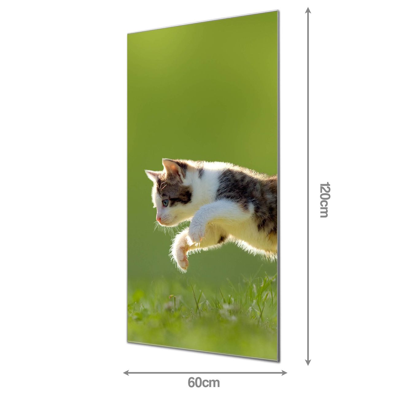 Material  4mm Sicherheitsglas mit Metallrückwand Eigenschaften  beschreibbar, magnetisch, kratzfest Maße  60x120x0,6cm, 10,80 kg schwer Motiv  Nummer 10729 Jagende Katze Zubehör  inklusive 4 Neodym-Magnete