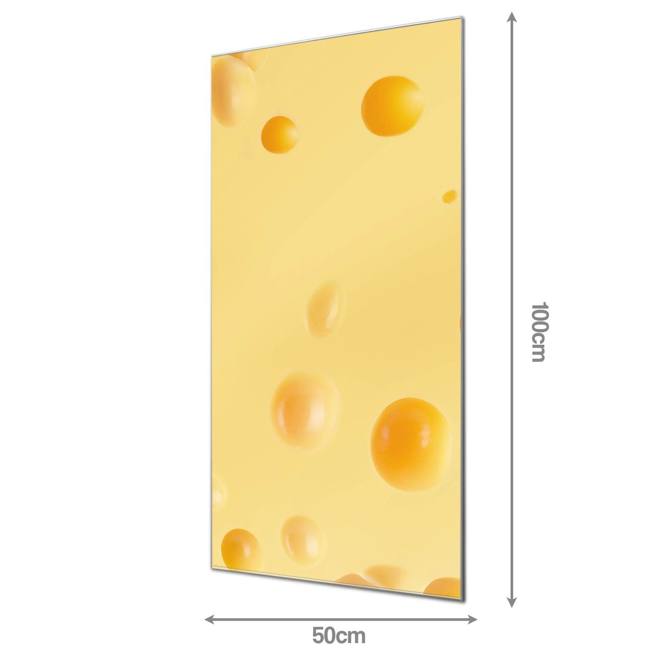 Material: 4mm Sicherheitsglas mit Metallrückwand Eigenschaften: beschreibbar, magnetisch, kratzfest Maße: 50x100x0,6cm, 7,50 kg schwer Motiv Nummer 10263 Käse Zubehör: inklusive 4 Neodym-Magnete