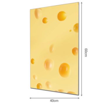 Material: 4mm Sicherheitsglas mit Metallrückwand Eigenschaften: beschreibbar, magnetisch, kratzfest Maße: 40x60x0,6cm, 3,60 kg schwer Motiv Nummer 10263 Käse Zubehör: inklusive 4 Neodym-Magnete