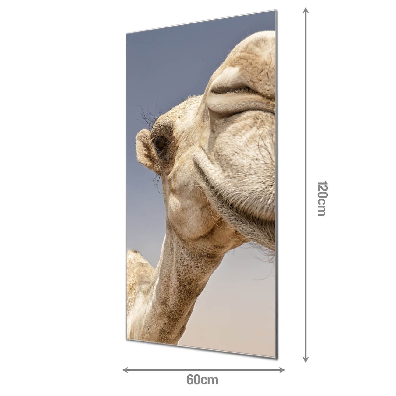 Material: 4mm Sicherheitsglas mit Metallrückwand Eigenschaften: beschreibbar, magnetisch, kratzfest Maße: 60x120x0,6cm, 10,80 kg schwer Motiv Nummer 10303 Kamele Zubehör: inklusive 4 Neodym-Magnete