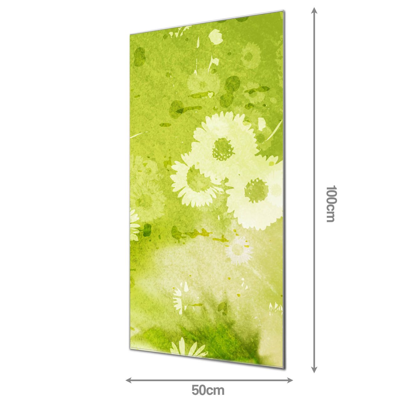 Material: 4mm Sicherheitsglas mit Metallrückwand Eigenschaften: beschreibbar, magnetisch, kratzfest Maße: 50x100x0,6cm, 7,50 kg schwer Motiv Nummer 10390 Kamille Grün Zubehör: inklusive 4 Neodym-Magnete