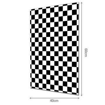 Material: 4mm Sicherheitsglas mit Metallrückwand Eigenschaften: beschreibbar, magnetisch, kratzfest Maße: 40x60x0,6cm, 3,60 kg schwer Motiv Nummer 10608 Karo Schwarz Zubehör: inklusive 4 Neodym-Magnete