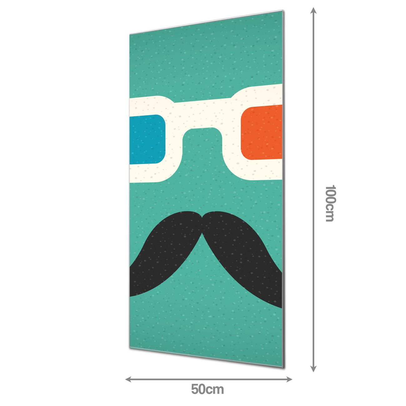 Material: 4mm Sicherheitsglas mit Metallrückwand Eigenschaften: beschreibbar, magnetisch, kratzfest Maße: 50x100x0,6cm, 7,50 kg schwer Motiv Nummer 12500 Kinobrille Zubehör: inklusive 4 Neodym-Magnete