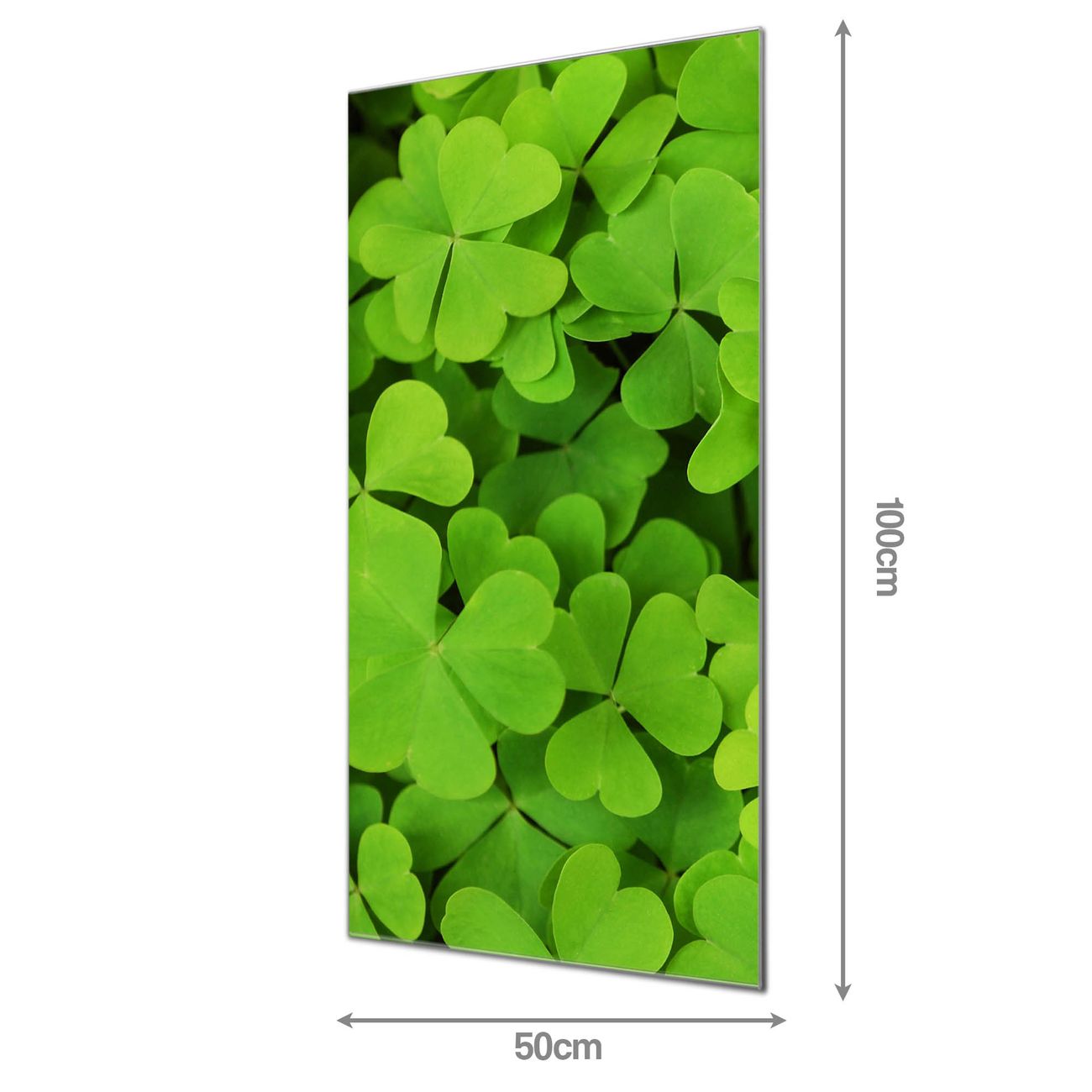 Material: 4mm Sicherheitsglas mit Metallrückwand Eigenschaften: beschreibbar, magnetisch, kratzfest Maße: 50x100x0,6cm, 7,50 kg schwer Motiv Nummer 10049 Klee Zubehör: inklusive 4 Neodym-Magnete