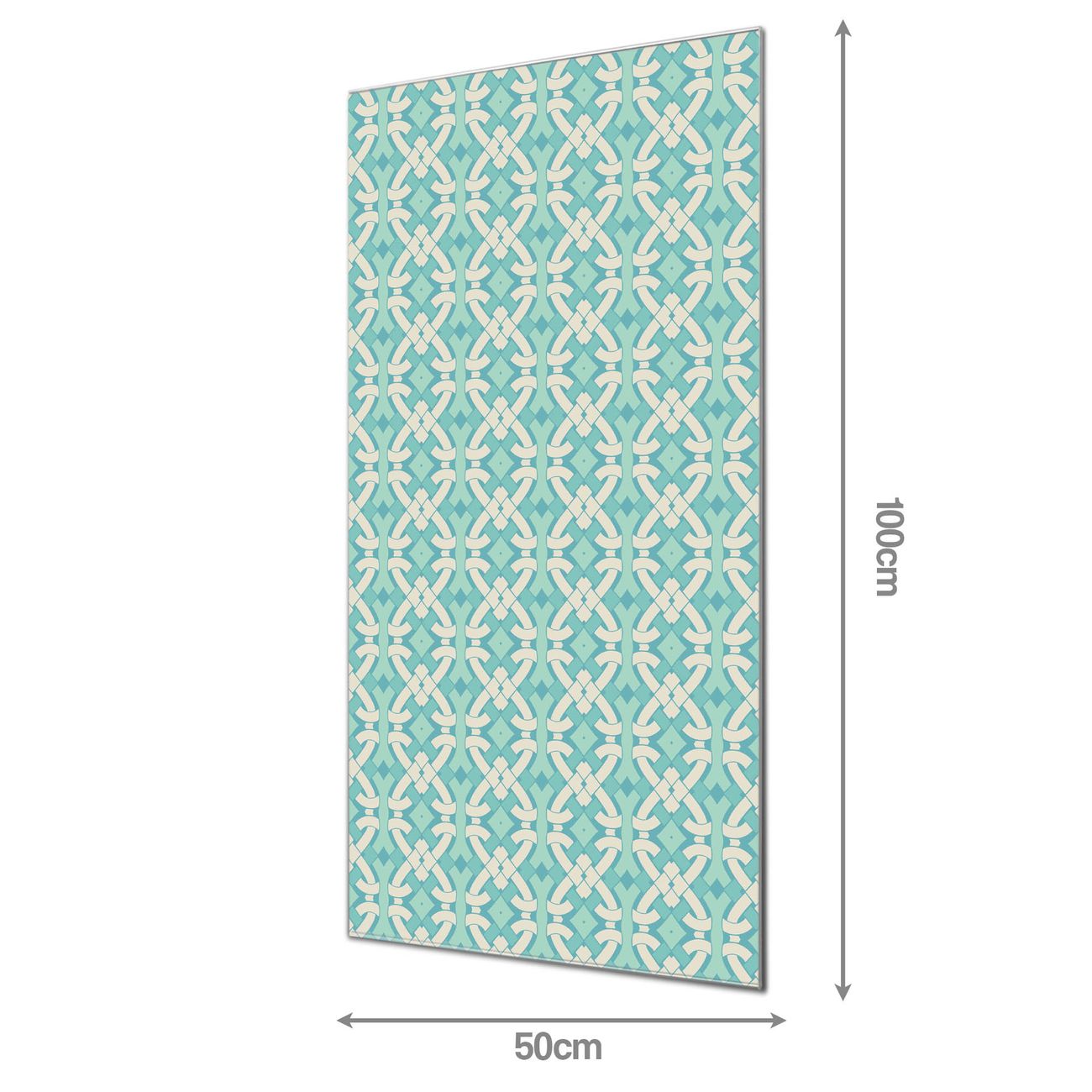 Material: 4mm Sicherheitsglas mit Metallrückwand Eigenschaften: beschreibbar, magnetisch, kratzfest Maße: 50x100x0,6cm, 7,50 kg schwer Motiv Nummer 11872 Knoten Türkis Zubehör: inklusive 4 Neodym-Magnete