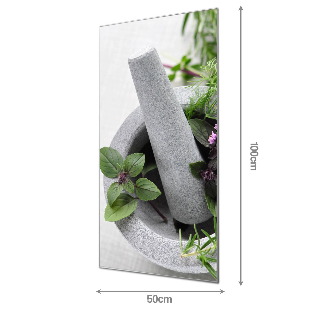 Material: 4mm Sicherheitsglas mit Metallrückwand Eigenschaften: beschreibbar, magnetisch, kratzfest Maße: 50x100x0,6cm, 7,50 kg schwer Motiv Nummer 10151 Kräuter Zubehör: inklusive 4 Neodym-Magnete