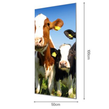Material: 4mm Sicherheitsglas mit Metallrückwand Eigenschaften: beschreibbar, magnetisch, kratzfest Maße: 50x100x0,6cm, 7,50 kg schwer Motiv Nummer 10225 Kühe Zubehör: inklusive 4 Neodym-Magnete