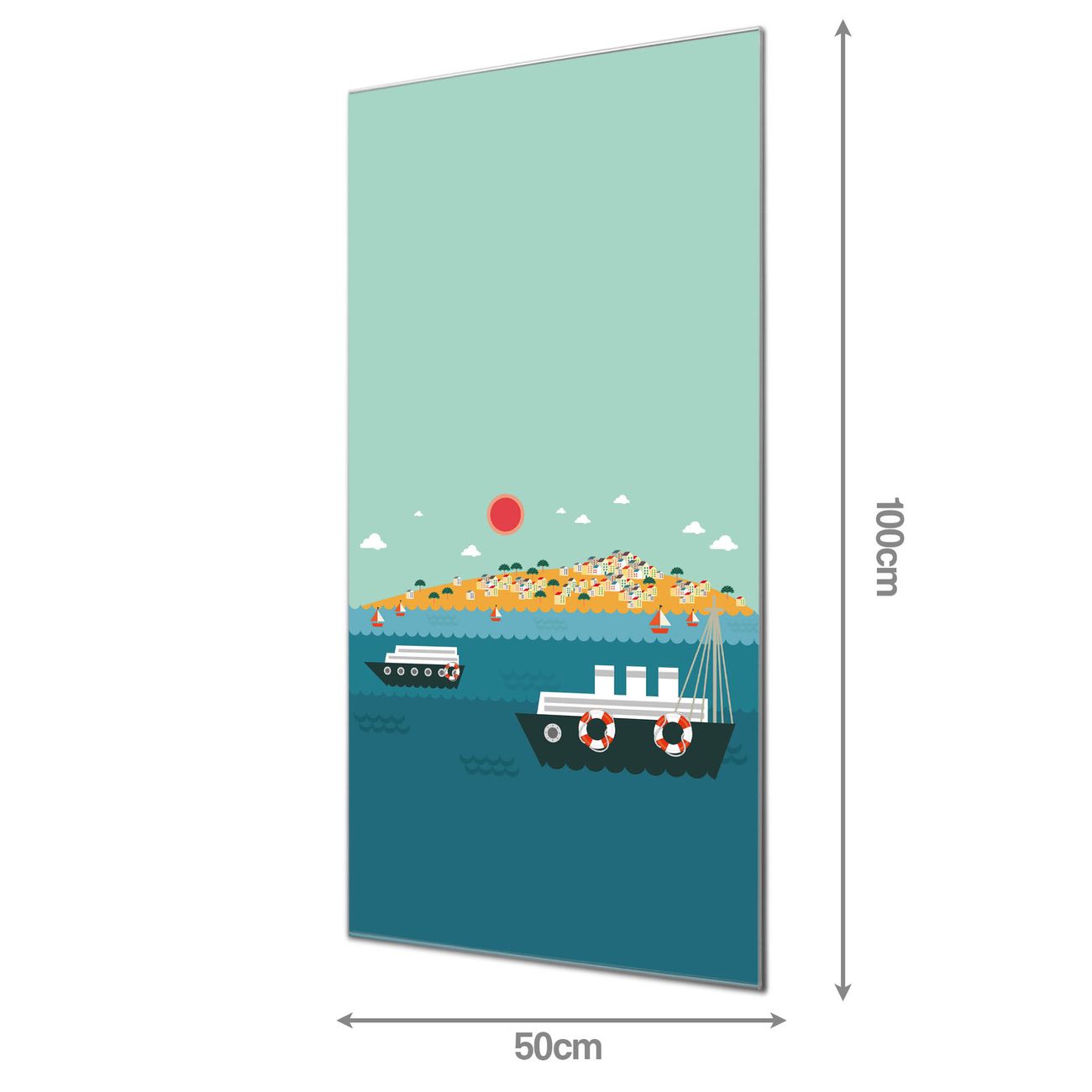 Material: 4mm Sicherheitsglas mit Metallrückwand Eigenschaften: beschreibbar, magnetisch, kratzfest Maße: 50x100x0,6cm, 7,50 kg schwer Motiv Nummer 11921 Land in Sicht Zubehör: inklusive 4 Neodym-Magnete