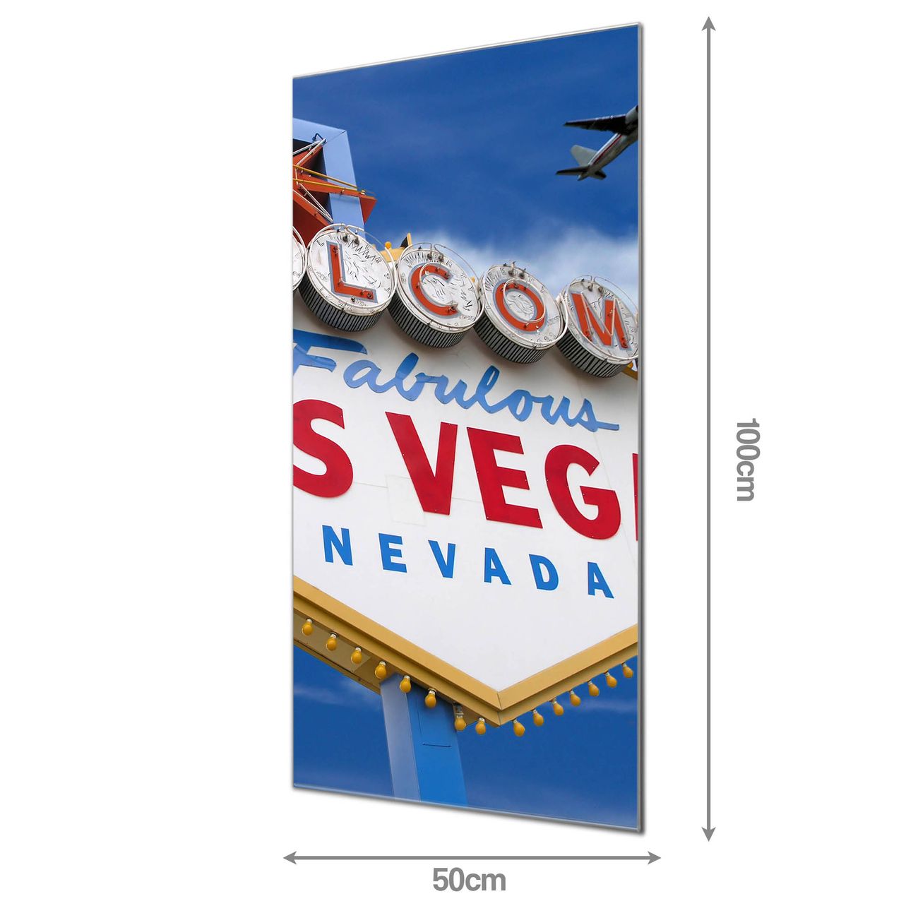 Material: 4mm Sicherheitsglas mit Metallrückwand Eigenschaften: beschreibbar, magnetisch, kratzfest Maße: 50x100x0,6cm, 7,50 kg schwer Motiv Nummer 10127 Las Vegas Zubehör: inklusive 4 Neodym-Magnete