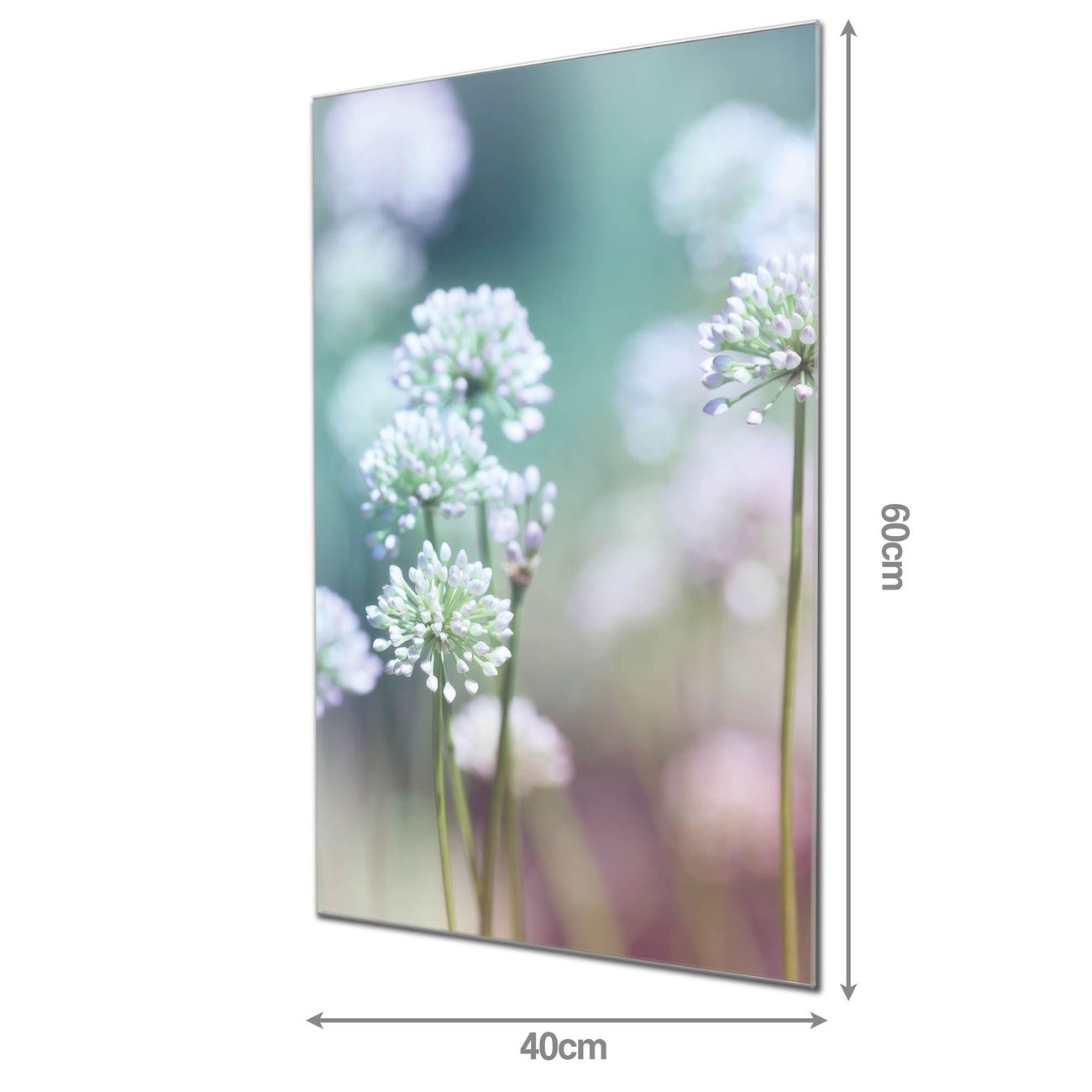 Material: 4mm Sicherheitsglas mit Metallrückwand Eigenschaften: beschreibbar, magnetisch, kratzfest Maße: 40x60x0,6cm, 3,60 kg schwer Motiv Nummer 11577 Lauchblüte Zubehör: inklusive 4 Neodym-Magnete
