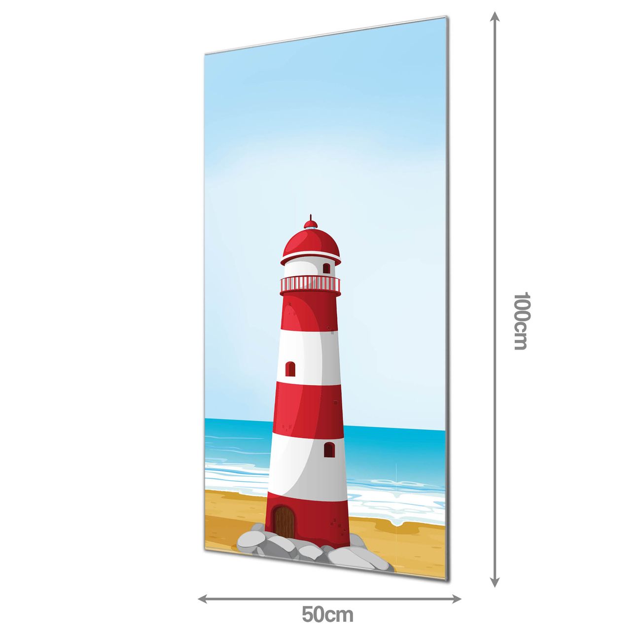 Material: 4mm Sicherheitsglas mit Metallrückwand Eigenschaften: beschreibbar, magnetisch, kratzfest Maße: 50x100x0,6cm, 7,50 kg schwer Motiv Nummer 11243 Leuchtturm Illustration Zubehör: inklusive 4 Neodym-Magnete