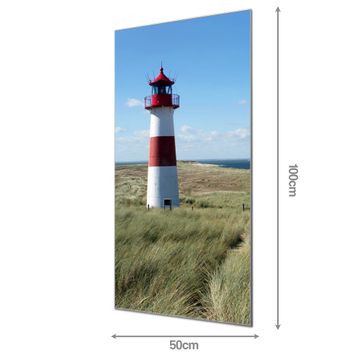 Material: 4mm Sicherheitsglas mit Metallrückwand Eigenschaften: beschreibbar, magnetisch, kratzfest Maße: 50x100x0,6cm, 7,50 kg schwer Motiv Nummer 10082 Leuchtturm Zubehör: inklusive 4 Neodym-Magnete