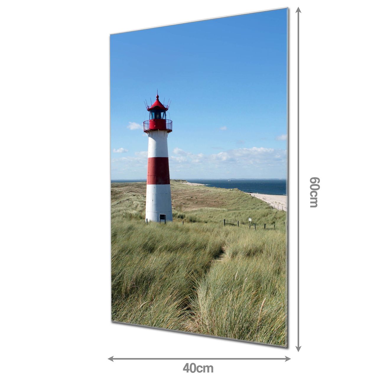 Material: 4mm Sicherheitsglas mit Metallrückwand Eigenschaften: beschreibbar, magnetisch, kratzfest Maße: 40x60x0,6cm, 3,60 kg schwer Motiv Nummer 10082 Leuchtturm Zubehör: inklusive 4 Neodym-Magnete
