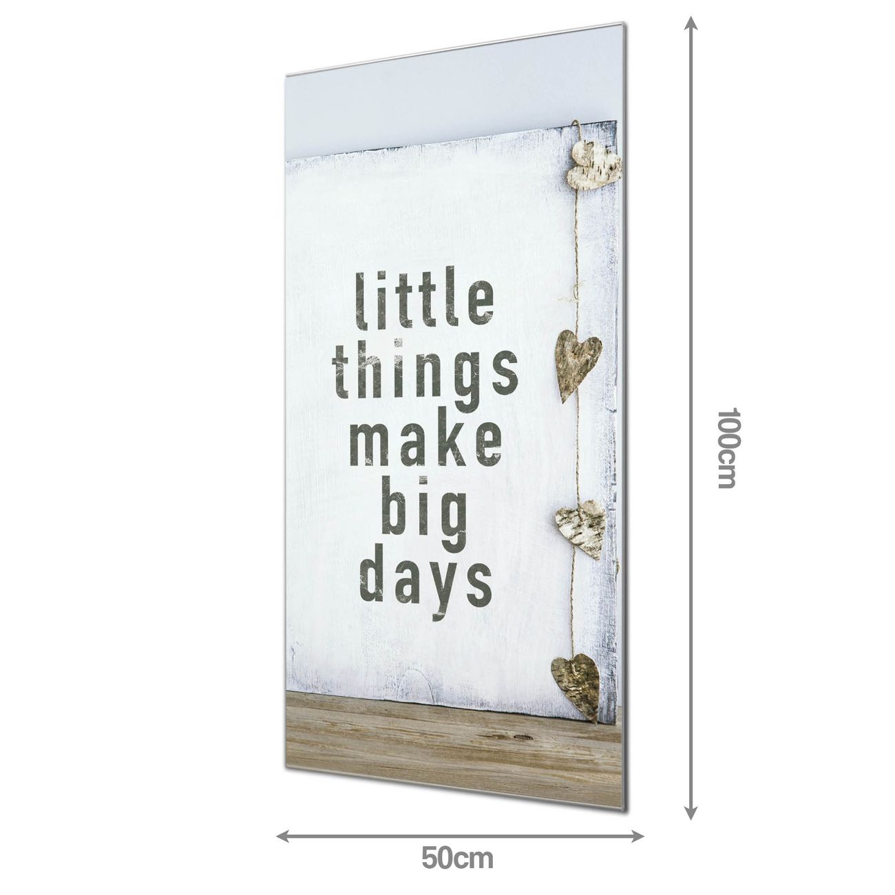 Material: 4mm Sicherheitsglas mit Metallrückwand Eigenschaften: beschreibbar, magnetisch, kratzfest Maße: 50x100x0,6cm, 7,50 kg schwer Motiv Nummer 12708 Little Things Zubehör: inklusive 4 Neodym-Magnete