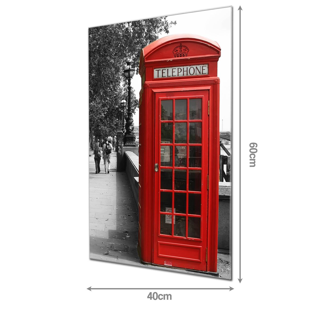 Material: 4mm Sicherheitsglas mit Metallrückwand Eigenschaften: beschreibbar, magnetisch, kratzfest Maße: 40x60x0,6cm, 3,60 kg schwer Motiv Nummer 10077 London Red Telephone Zubehör: inklusive 4 Neodym-Magnete