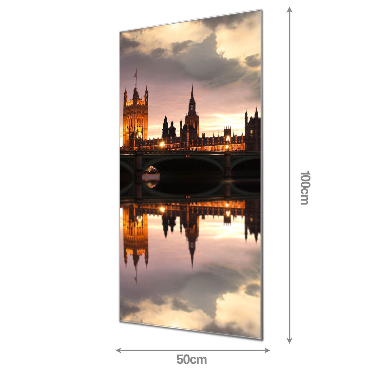 Material: 4mm Sicherheitsglas mit Metallrückwand Eigenschaften: beschreibbar, magnetisch, kratzfest Maße: 50x100x0,6cm, 7,50 kg schwer Motiv Nummer 10205 Palace of Westminster Zubehör: inklusive 4 Neodym-Magnete