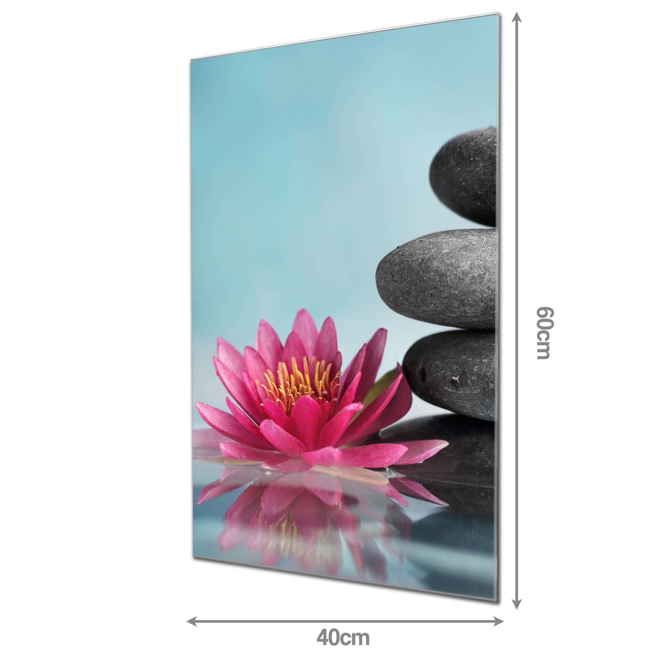 Material: 4mm Sicherheitsglas mit Metallrückwand Eigenschaften: beschreibbar, magnetisch, kratzfest Maße: 40x60x0,6cm, 3,60 kg schwer Motiv Nummer 10818 Lotus Und Steine Zubehör: inklusive 4 Neodym-Magnete