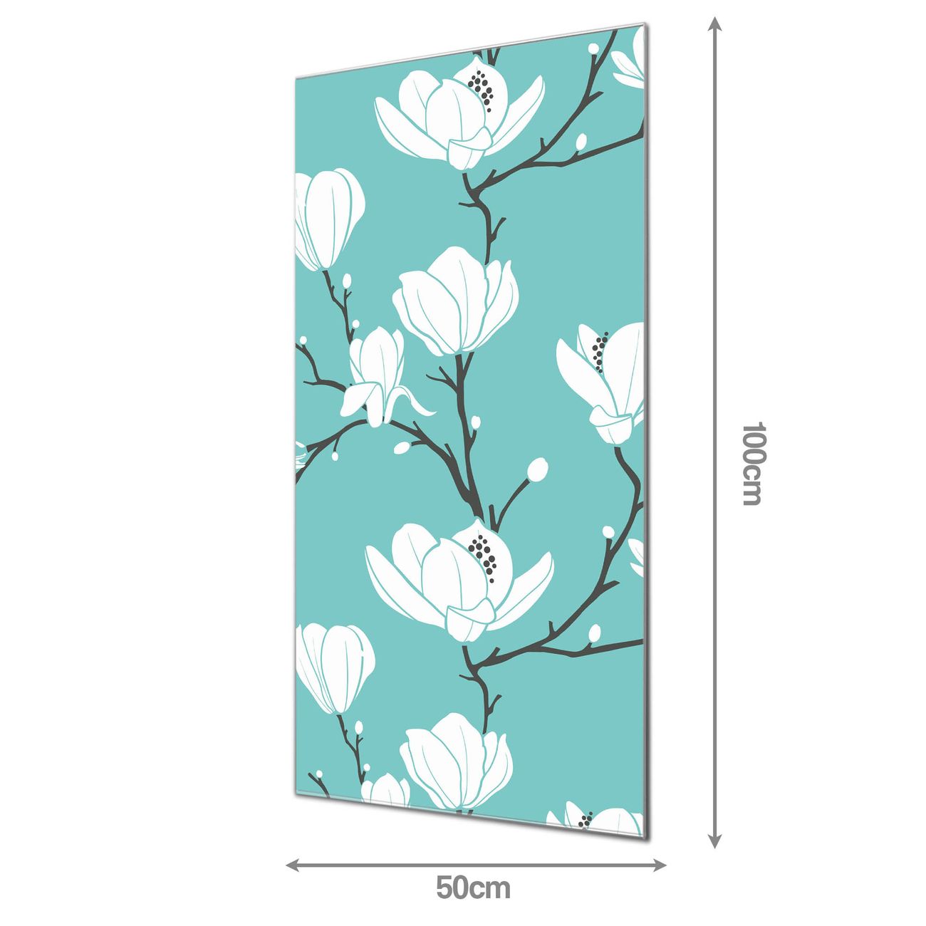 Material: 4mm Sicherheitsglas mit Metallrückwand Eigenschaften: beschreibbar, magnetisch, kratzfest Maße: 50x100x0,6cm, 7,50 kg schwer Motiv Nummer 10339 Magnolien Zubehör: inklusive 4 Neodym-Magnete