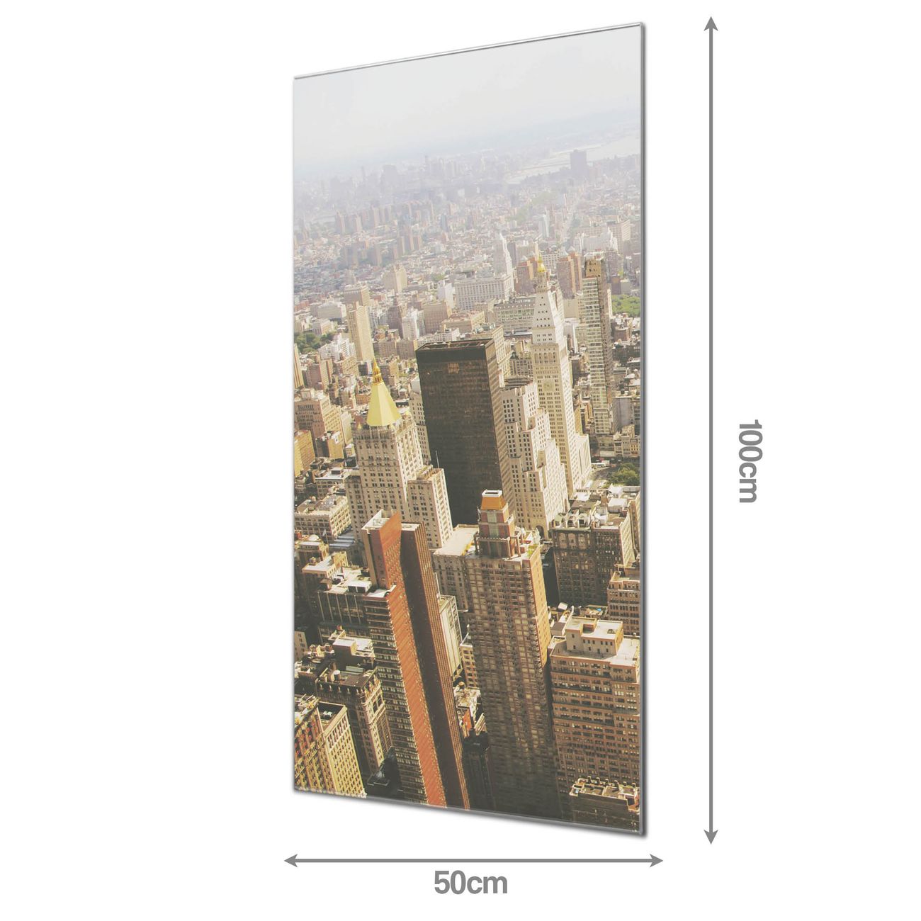Material: 4mm Sicherheitsglas mit Metallrückwand Eigenschaften: beschreibbar, magnetisch, kratzfest Maße: 50x100x0,6cm, 7,50 kg schwer Motiv Nummer 11769 Manhattan 1 Zubehör: inklusive 4 Neodym-Magnete