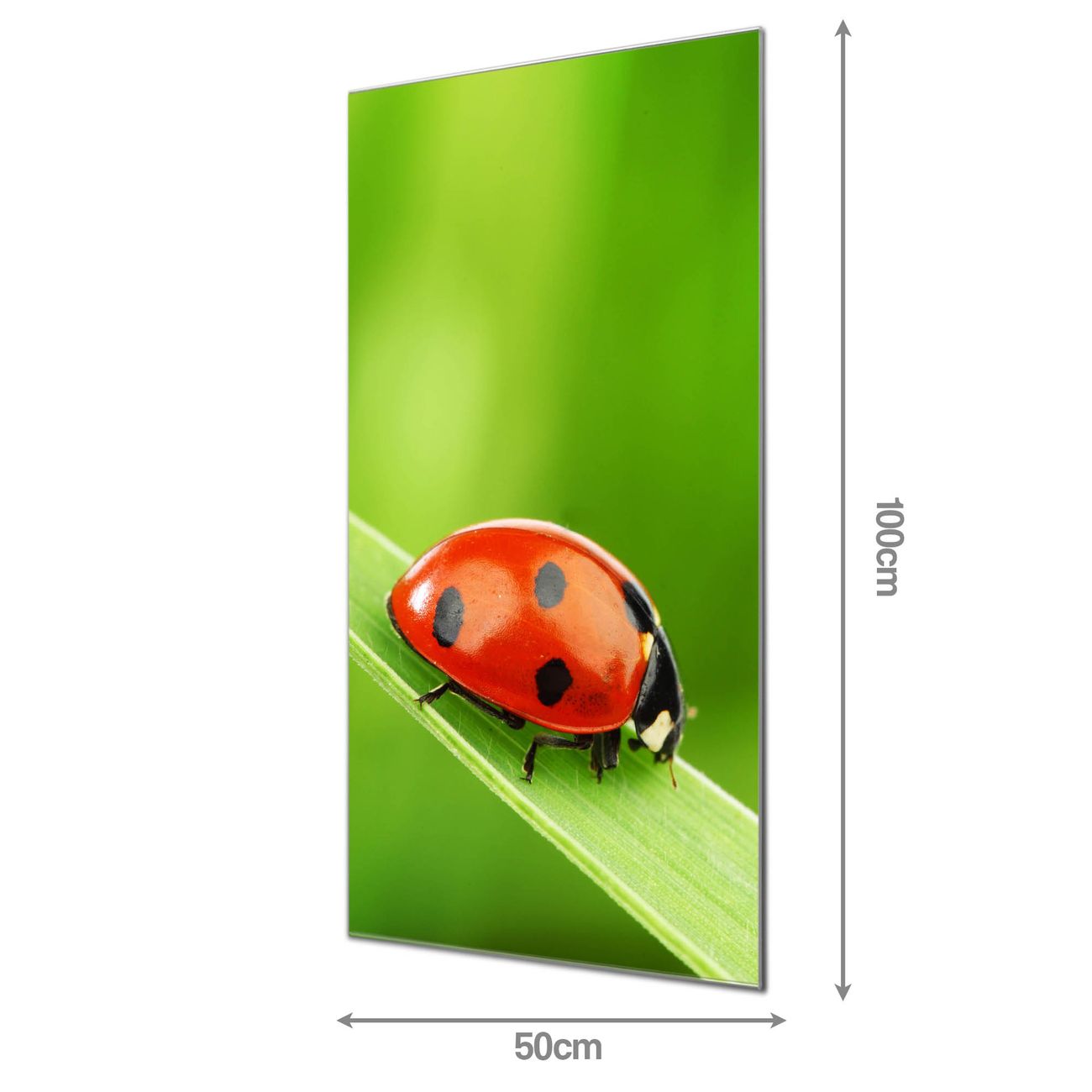Material: 4mm Sicherheitsglas mit Metallrückwand Eigenschaften: beschreibbar, magnetisch, kratzfest Maße: 50x100x0,6cm, 7,50 kg schwer Motiv Nummer 10047 Marienkäfer Zubehör: inklusive 4 Neodym-Magnete