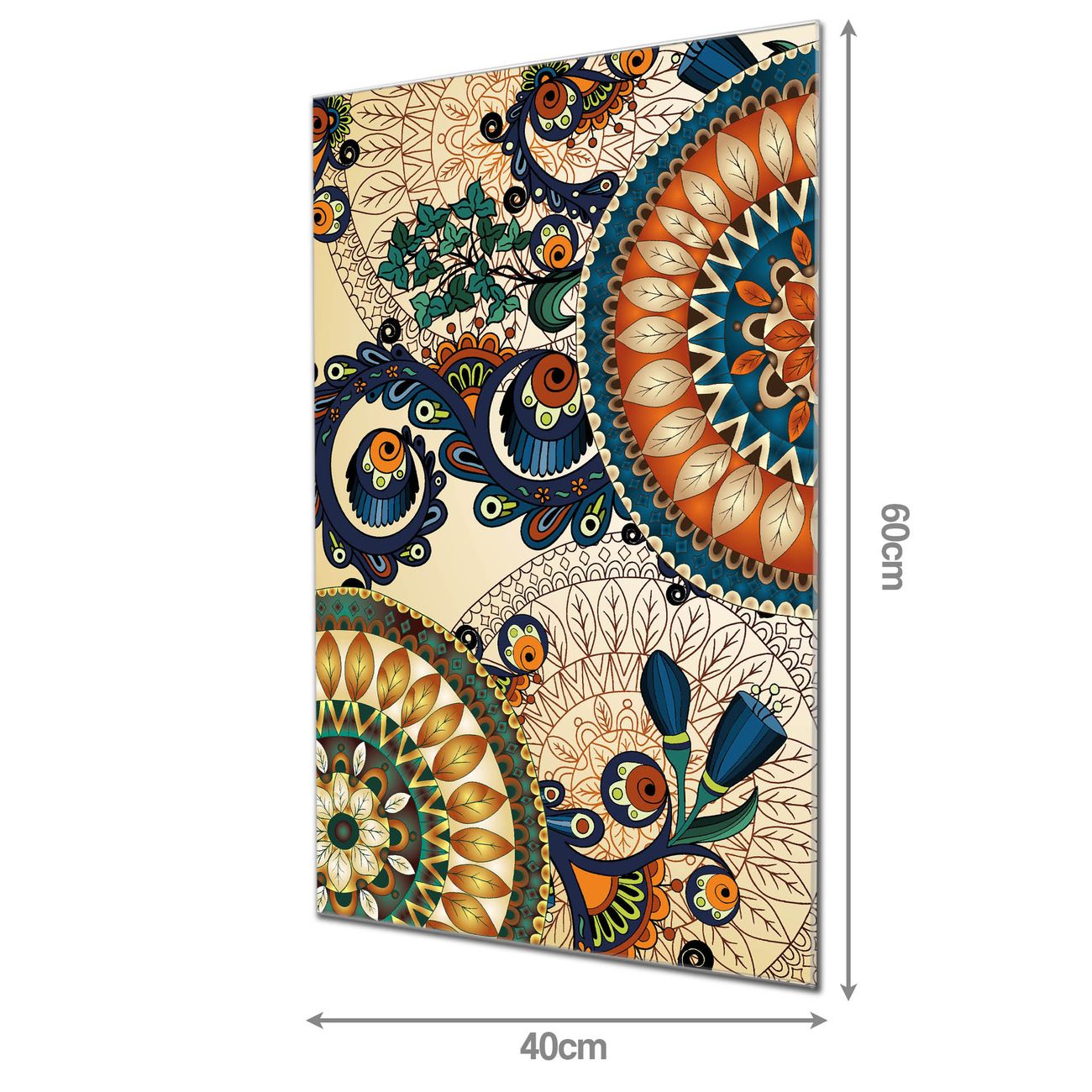 Material: 4mm Sicherheitsglas mit Metallrückwand Eigenschaften: beschreibbar, magnetisch, kratzfest Maße: 40x60x0,6cm, 3,60 kg schwer Motiv Nummer 10984 Modernes Mandala Zubehör: inklusive 4 Neodym-Magnete