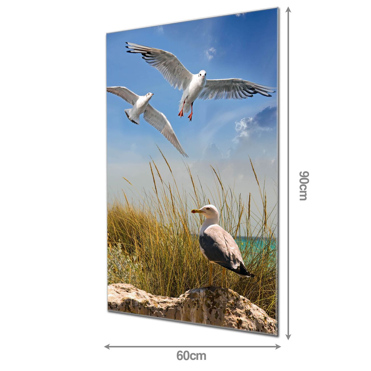 Material  4mm Sicherheitsglas mit Metallrückwand Eigenschaften  beschreibbar, magnetisch, kratzfest Maße  60x90x0,6cm, 8,10 kg schwer Motiv  Nummer 10494 Möwen Zubehör  inklusive 4 Neodym-Magnete