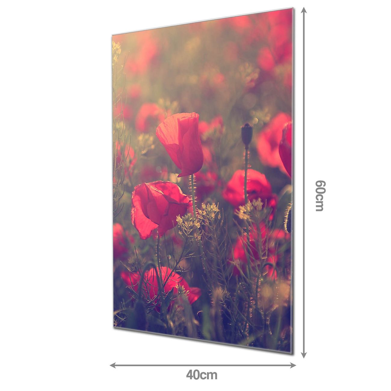 Material: 4mm Sicherheitsglas mit Metallrückwand Eigenschaften: beschreibbar, magnetisch, kratzfest Maße: 40x60x0,6cm, 3,60 kg schwer Motiv Nummer 11632 Mohn Zubehör: inklusive 4 Neodym-Magnete
