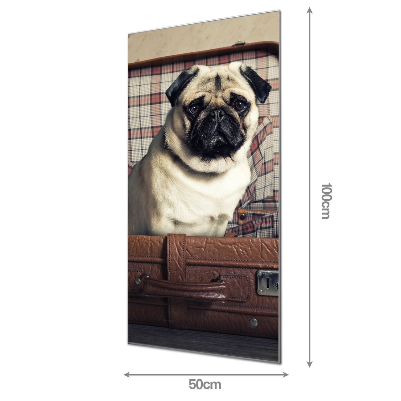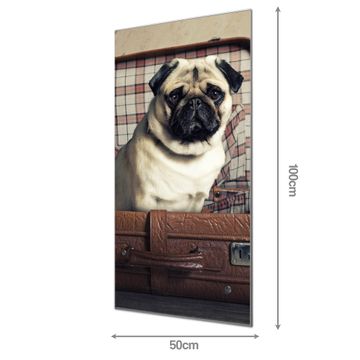 Material: 4mm Sicherheitsglas mit Metallrückwand Eigenschaften: beschreibbar, magnetisch, kratzfest Maße: 50x100x0,6cm, 7,50 kg schwer Motiv Nummer 12506 Mops im Koffer Zubehör: inklusive 4 Neodym-Magnete