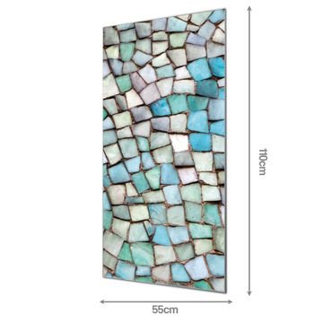 Material: 4mm Sicherheitsglas mit Metallrückwand Eigenschaften: beschreibbar, magnetisch, kratzfest Maße: 55x110x0,6cm, 9,08 kg schwer Motiv Nummer 11541 Mosaik Blau Zubehör: inklusive 4 Neodym-Magnete