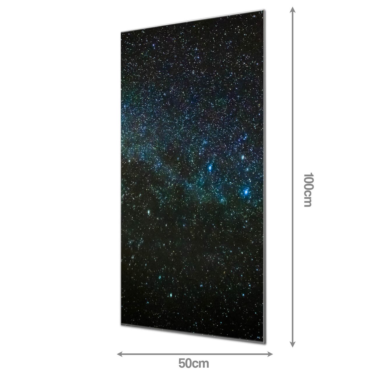 Material: 4mm Sicherheitsglas mit Metallrückwand Eigenschaften: beschreibbar, magnetisch, kratzfest Maße: 50x100x0,6cm, 7,50 kg schwer Motiv Nummer 12721 Nachthimmel Zubehör: inklusive 4 Neodym-Magnete