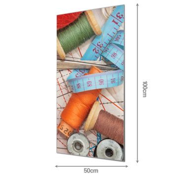 Material: 4mm Sicherheitsglas mit Metallrückwand Eigenschaften: beschreibbar, magnetisch, kratzfest Maße: 50x100x0,6cm, 7,50 kg schwer Motiv Nummer 10569 Nähen Zubehör: inklusive 4 Neodym-Magnete