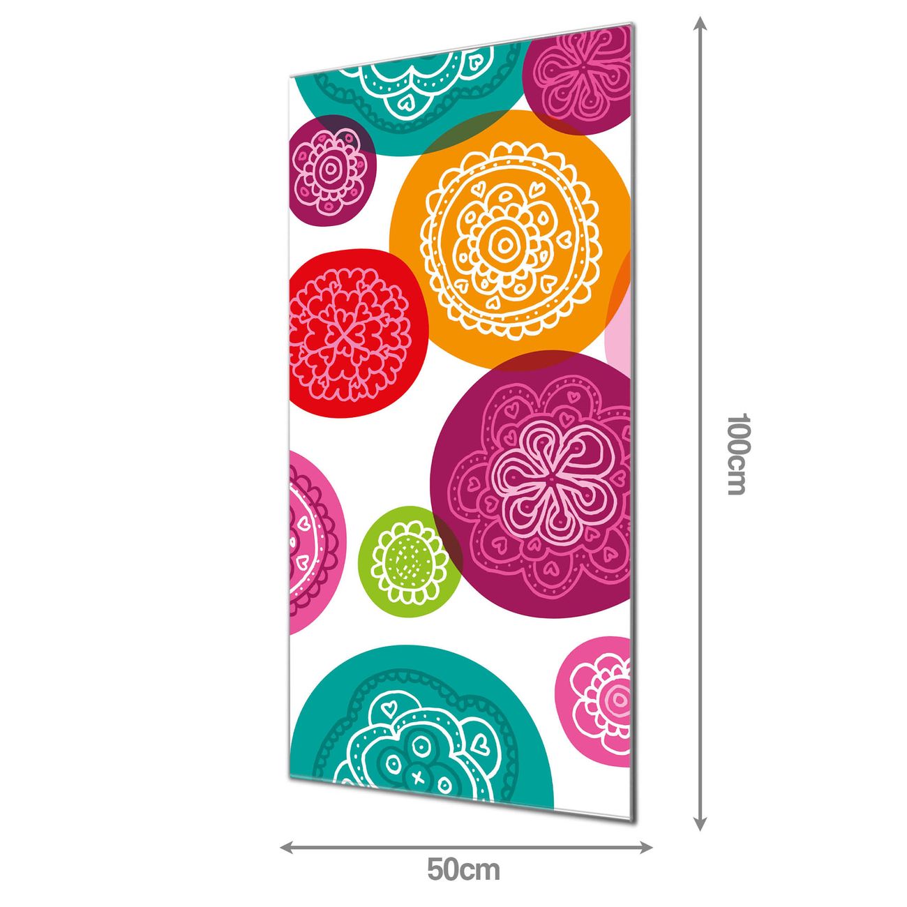 Material: 4mm Sicherheitsglas mit Metallrückwand Eigenschaften: beschreibbar, magnetisch, kratzfest Maße: 50x100x0,6cm, 7,50 kg schwer Motiv Nummer 11419 Naive Blüten Zubehör: inklusive 4 Neodym-Magnete