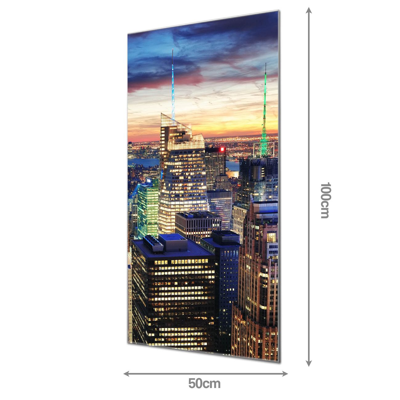 Material: 4mm Sicherheitsglas mit Metallrückwand Eigenschaften: beschreibbar, magnetisch, kratzfest Maße: 50x100x0,6cm, 7,50 kg schwer Motiv Nummer 12409 New York Sunset Zubehör: inklusive 4 Neodym-Magnete