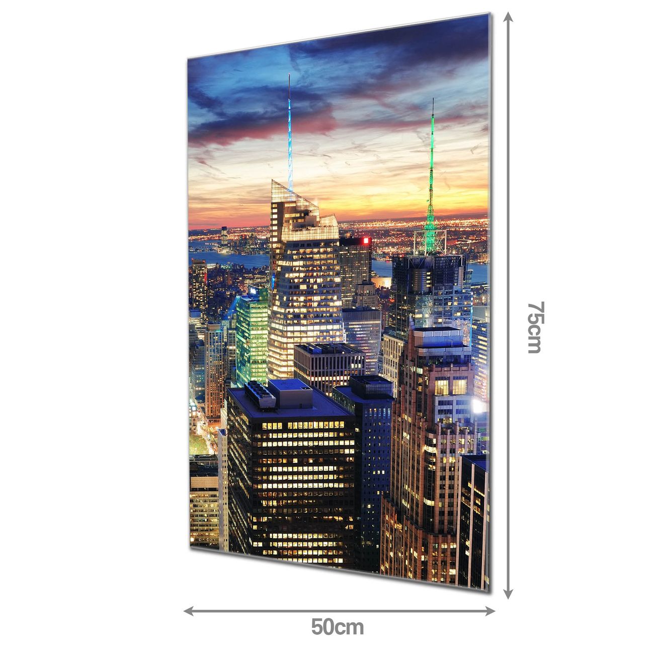Material: 4mm Sicherheitsglas mit Metallrückwand Eigenschaften: beschreibbar, magnetisch, kratzfest Maße: 50x75x0,6cm, 5,63 kg schwer Motiv Nummer 12409 New York Sunset Zubehör: inklusive 4 Neodym-Magnete