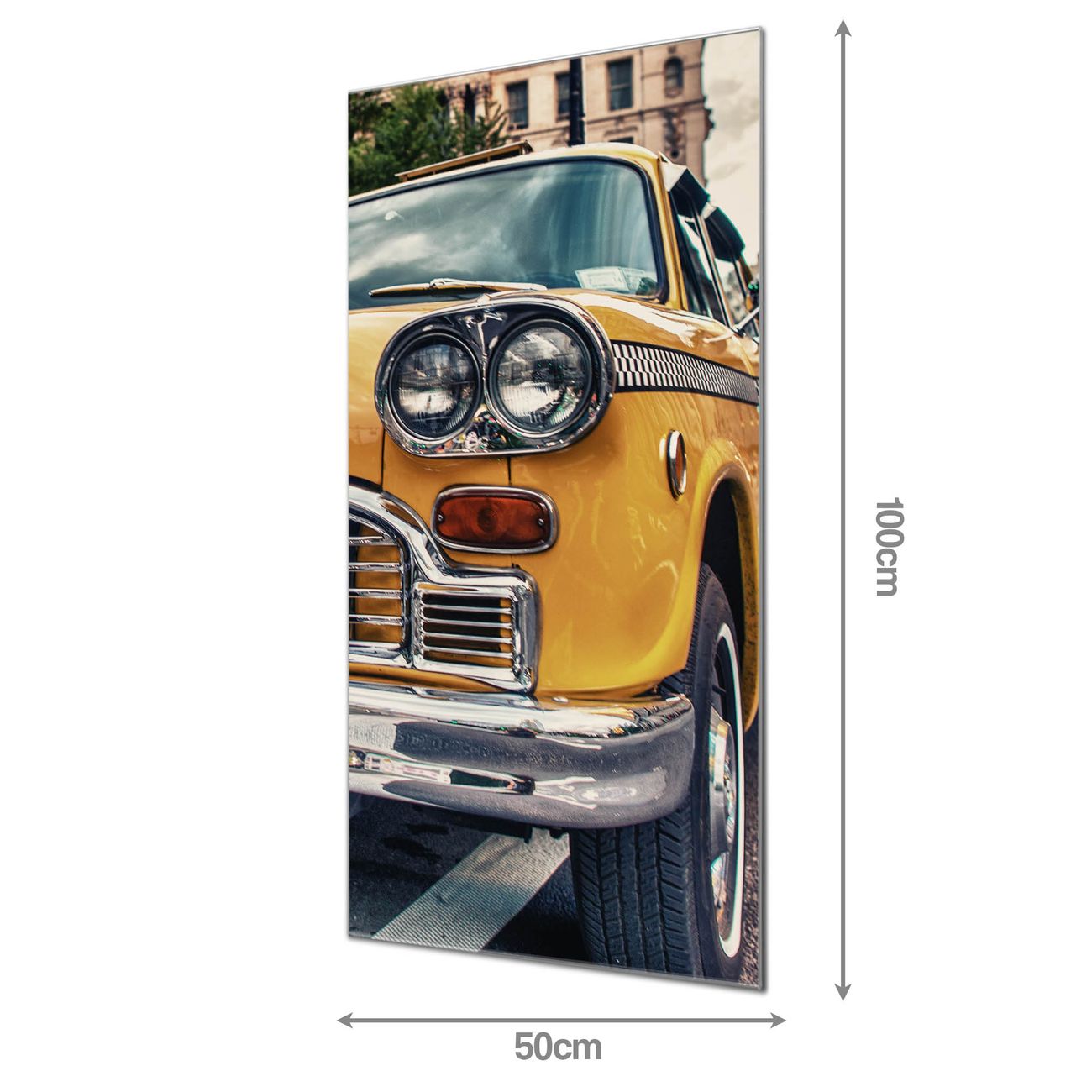 Material: 4mm Sicherheitsglas mit Metallrückwand Eigenschaften: beschreibbar, magnetisch, kratzfest Maße: 50x100x0,6cm, 7,50 kg schwer Motiv Nummer 12418 Yellow Cab Zubehör: inklusive 4 Neodym-Magnete