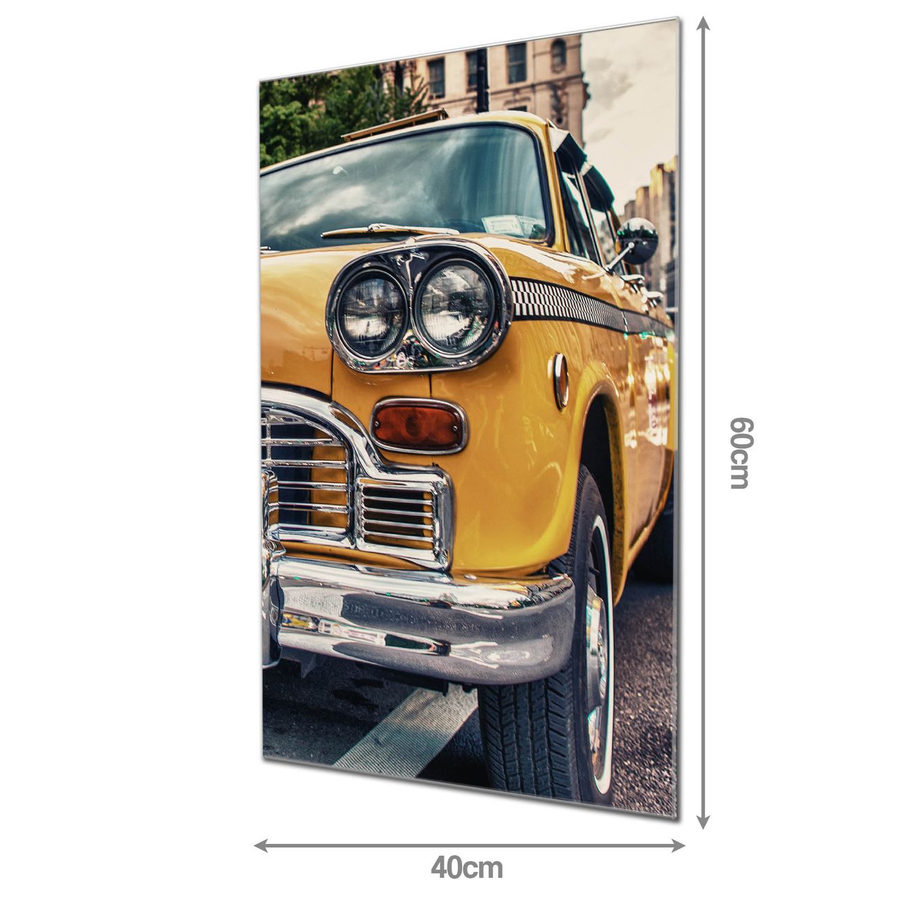 Material: 4mm Sicherheitsglas mit Metallrückwand Eigenschaften: beschreibbar, magnetisch, kratzfest Maße: 40x60x0,6cm, 3,60 kg schwer Motiv Nummer 12418 Yellow Cab Zubehör: inklusive 4 Neodym-Magnete