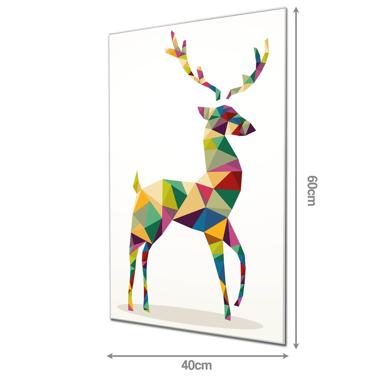 Material: 4mm Sicherheitsglas mit Metallrückwand Eigenschaften: beschreibbar, magnetisch, kratzfest Maße: 40x60x0,6cm, 3,60 kg schwer Motiv Nummer 12104 Origami Hirsch Zubehör: inklusive 4 Neodym-Magnete